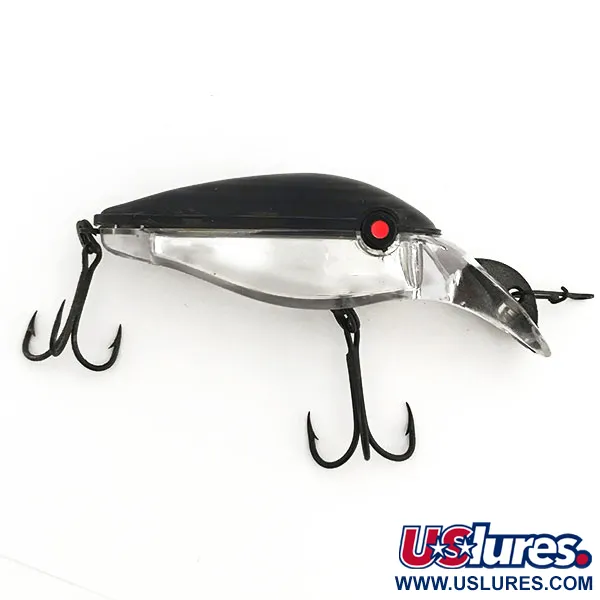 Con un llamativo contraste de dos tonos, la mitad superior negra opaca de este cuerpo de plástico pasa a una sección inferior cristalina. Este Rebel Blackstar, con código de producto 9233, es un hallazgo notable para los coleccionistas de aparejos fabricados en Estados Unidos. El diseño incorpora un par de anzuelos triples negros y un babero transparente integrado directamente en el morro. Cada ojo presenta una pupila roja brillante que destaca sobre el molde oscuro de la cabeza. Con un tamaño de 6 cm (2 1/4") y un peso de 14 g (1/2 oz), la construcción del señuelo permite un sonajero interno ruidoso. El ejemplar está en excelente forma, sin signos de uso, lo que garantiza una calificación de estado de 5/5. Un enganche negro está preinstalado en el ojal del babero.