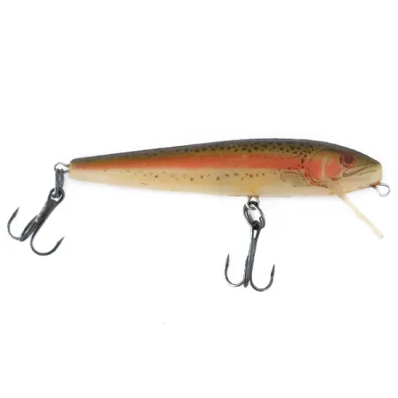 Con un peso de 1/8oz (4g), este minnow de fabricación estadounidense muestra el detallado trabajo de acabado por el que Rebel se hizo famoso en sus inicios. Designado con el código de producto 11085, el señuelo presenta un patrón realista de Rainbow Trout sobre una base Ghost, lo que le confiere una sutil translucidez. Con una longitud de 2 3/4" (7cm), el cuerpo de plástico está equipado con dos poteras afiladas sujetas por robustas anillas abiertas. El babero transparente integrado está diseñado para alcanzar profundidades de entre 0,9-1,8m (3-6ft), lo que lo convierte en una opción versátil tanto para lances como para curricán. Este ejemplar se encuentra en un estado 5/5, mostrando la integridad bien conservada de sus herrajes y el fino moteado a lo largo de sus flancos. Los pescadores suelen tener éxito con este modelo flotante utilizando una recogida lineal o una cadencia clásica de parada y arranque.