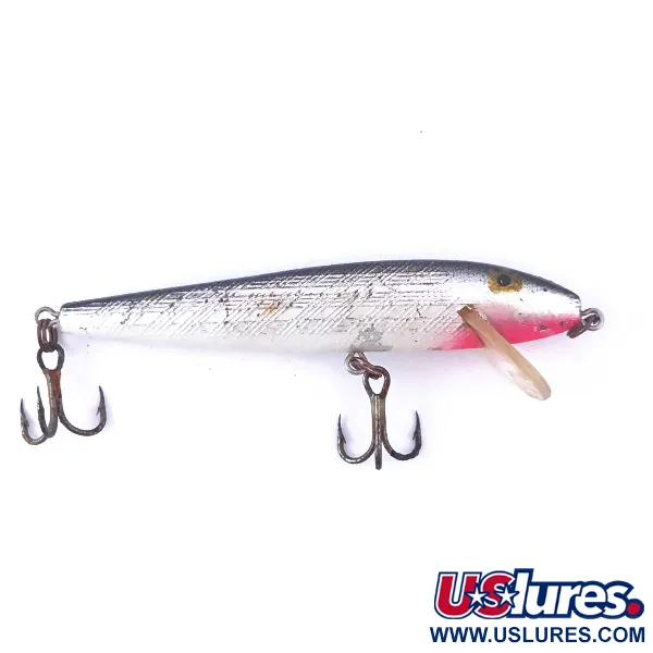 Un patrón de escamas cruzadas grabado en un cuerpo plateado define a este ejemplar fabricado en EE. UU. Conocido por el código de producto 4055, este Rebel Floater es un señuelo ligero de 3 g (3/32 oz) que mide 6,5 cm (2 1/2") de largo. El color figura como Natural, aunque visualmente presenta un prominente destello rosado rojizo en la zona de la garganta, justo debajo del babero de plástico transparente. Diseñado para una profundidad de natación de 0,9 m (3 ft), su diseño está optimizado tanto para lance como para curricán. En cuanto a su estado, el señuelo tiene una calificación de 4/5, mostrando un desgaste superficial honesto en el acabado por el uso anterior, mientras que ambos anzuelos triples permanecen firmemente sujetos. El babero circular está angulado para facilitar su perfil específico de profundidad de flotación-inmersión.