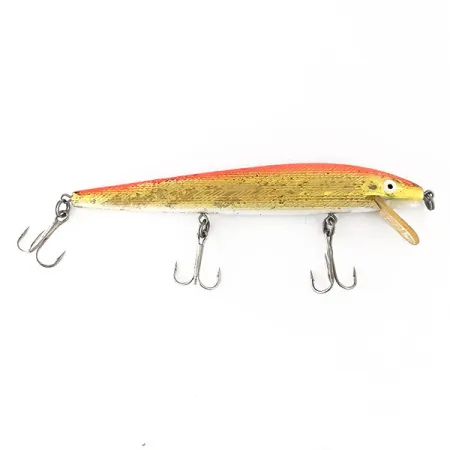 Tonos dorados y naranjas dominan el acabado de este señuelo tipo minnow de 12 cm (4 3/4"). Con un peso de 9 g (1/3 oz), este Rebel Floater F12, identificado con el código 11148, está fabricado tanto para lance como para curricán. El babero transparente está marcado con el nombre Rebel Float-R y su origen de fabricación en EE. UU. Alcanza profundidades de 1,5-2,1 m (5-7 pies) para pescar salmón, perca, lucioperca, trucha o lucio. El equipo consta de tres anzuelos triples montados en la parte inferior y la cola. Con una calificación de 4/5, el cuerpo muestra un ligero desgaste superficial en el acabado dorado metálico y el lomo naranja rojizo, con los icónicos puntos verdes de los ojos todavía claramente visibles en la cabeza.