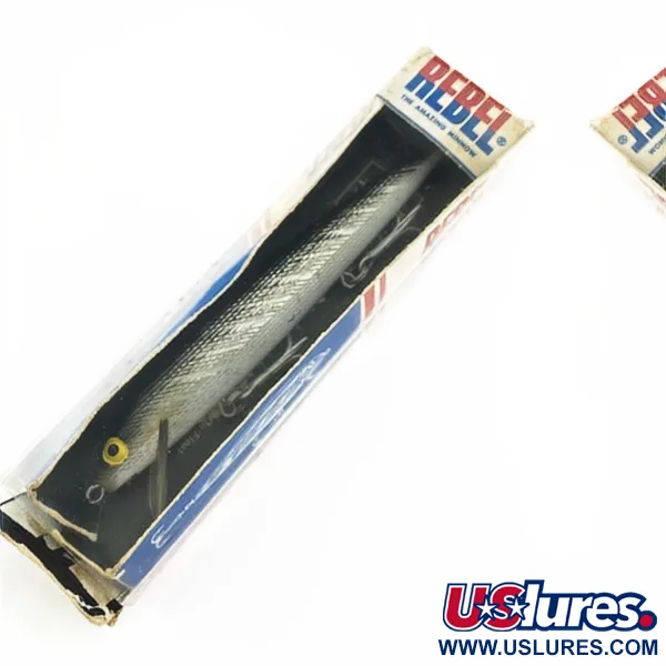 Los acabados de escamas plateadas como el de este Floater F12 definen la era del plástico de mediados de siglo de los aparejos de pesca estadounidenses. Con un peso de 1/3 oz (9 g) y una longitud de 4 3/4" (12 cm), este ejemplar se encuentra sin usar y conservado en su caja original con ventana. Los señuelos Rebel, originarios de EE. UU., fueron pioneros en el uso de plásticos de alta calidad para lograr una flotabilidad y durabilidad constantes. Este modelo en particular, identificado con el código de producto 23929, está diseñado para alcanzar una profundidad de trabajo de 4 a 6 pies (1,2–1,8 m) cuando se utiliza para técnicas de lanzado o curricán. El cuerpo plateado reflectante se acentúa con tres robustos anzuelos triples, lo que ilustra los herrajes resistentes que Rebel eligió para sus perfiles de minnow más grandes. La propia caja lleva la marca de los inicios, un guiño al estilo de embalaje histórico de la empresa. Los grandes ojos con borde amarillo proporcionan un punto focal contra el patrón lateral texturizado. El babero de plástico transparente está integrado de forma segura en el morro, asegurando que el señuelo se mantenga dentro de su rango previsto de 1,2 a 1,8 m (3,9–5,9 pies) durante una recogida lineal o una presentación de stop-and-go.
