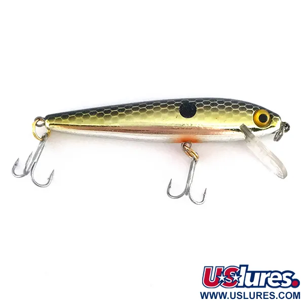Con una clásica transición de color oro a plata y un distintivo patrón de escamas en panal en el lomo, este minnow de plástico fabricado en EE. UU. refleja el diseño confiable por el que Rebel es reconocida. Con un peso de 1/8 oz (4 g) y una longitud de 2 3/4" (7 cm), este ejemplar lleva el código de producto 8013. La gran mancha negra en el hombro y los llamativos ojos amarillos contrastan con el cuerpo metálico, un rasgo visual frecuente en los modelos vintage que imitan al sábalo. Como modelo F7 flotante, está diseñado para alcanzar profundidades de entre 0,9 y 1,8 m (3-6 ft) cuando si utiliza para lance o curricán ligero. El babero integrado transparente y los anzuelos triples plateados originales están en excelente estado, otorgando a este señuelo una calificación de 5/5. Su construcción es sólida, pensada para recogidas lineales o técnicas de stop-and-go en entornos de agua dulce.