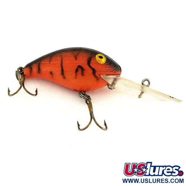 El patrón Brown Tiger como este fue un emblema de Rebel, con una base naranja intensa con rayas verticales negras en contraste y un lomo oscuro. Con el código de producto 9583, este modelo flotante mide 5 cm (2") y pesa 11 g (2/5 oz). Sus componentes están impecables, con dos anzuelos triples afilados y anillas abiertas resistentes, lo que le otorga una calificación de estado 5/5. Un babero transparente de gran tamaño está integrado en el diseño para alcanzar profundidades de 2,4 a 3,0 m (7,8 - 9,8 pies), siendo apto tanto para lanzado como para curricán. La icónica fabricación estadounidense destaca por su perfil jorobado y sus clásicos ojos amarillos pintados con grandes pupilas negras.