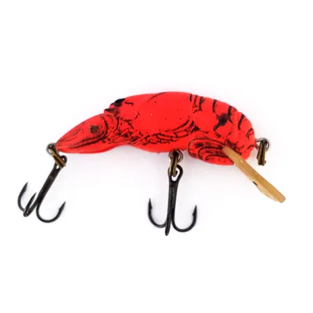 Tonos rojo fuego definen el acabado mate de este ejemplar reactivo a los rayos UV, diseñado para ser fluorescente en aguas profundas o turbias. Identificado con el código de producto 11041, este Rebel Wee-Crawfish tiene un perfil compacto de 1 1/2" (4 cm) y un peso de 3/32 oz (2,5 g). El cuerpo flotante está diseñado para alcanzar profundidades de 0,5 a 1,5 m durante la recuperación, cubriendo eficazmente las zonas de profundidad media. Presenta un detallado estampado negro que imita la anatomía de un cangrejo de río, combinado con un babero transparente y anzuelos triples negros. El señuelo está en una condición 5/5, sin mostrar signos de uso o desgaste en su vibrante superficie fluorescente. Este modelo fue fabricado en los EE. UU. y está destinado al lanzado o curricán para especies como la perca y el lucio.