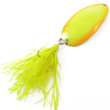 El cromo plateado en la parte posterior de esta cucharilla de 6 cm (2 1/4") proporciona un destello de alta visibilidad que complementa la cara frontal de color amarillo y naranja brillante. Con el código de producto 3812, este ejemplar de Red Eye Lures fabricado en EE. UU. tiene un peso específico de 10,5 g (3/8 oz) para profundidades de curricán. Un faldellín de silicona suave en color amarillo chartreuse está unido a la anilla abierta trasera, ocultando el anzuelo simple y añadiendo una textura diferente al perfil. Este modelo RED EYE se presenta en una condición 4/5, con la pintura bien conservada en el lado convexo y un acabado metálico limpio en el interior cóncavo. Los puntos de enganche son estructuralmente sólidos, con un único ojal en la cabeza para la conexión directa de la línea o un clip.