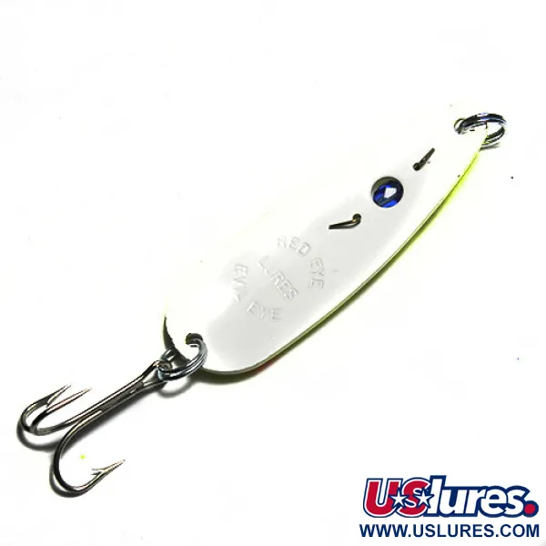 Un acabado amarillo de alta visibilidad hace que este señuelo de 3" (7,5 cm) destaque en cualquier caja de pesca. Identificado con el código de producto 0286, el Eppinger Red Eye Evil Eye es una cucharilla ondulante clásica fabricada en EE. UU. que muestra la icónica configuración de componentes de la marca, específicamente el ojo de cuenta de vidrio azul cableado a través del centro del cuerpo metálico. Este ejemplar de 3/4oz (22g) presenta un patrón de puntos naranjas brillantes sobre la base amarillo neón, con un acabado blanco limpio en el reverso. La cucharilla está equipada con anillas abiertas plateadas originales y un anzuelo triple afilado, todo en estado 5/5 como un ejemplar sin usar de la historia de la pesca. Este diseño particular refleja la era posterior a que Eppinger adquiriera la compañía Red Eye, manteniendo la característica del ojo de cuenta que buscan los coleccionistas. El cuerpo de metal grueso está diseñado para lances y curricán en diversas condiciones de agua.