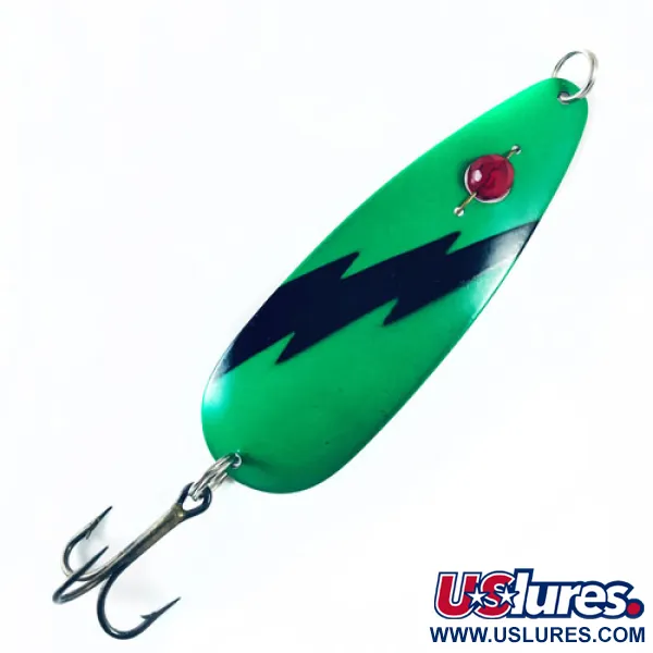 Un llamativo rayo negro cruza la cara verde vibrante de esta cucharilla ondulante vintage, un diseño distintivo de la serie Eppinger Red Eye Evil Eye. Esta cucharilla de 3 1/2" (9 cm) cuenta con la icónica cuenta de vidrio rojo facetado que da nombre al "Red Eye", montada de forma segura cerca de la cabeza para proporcionar un punto focal claro. Con un peso de 1/3 oz (9 g), el señuelo está diseñado para un lance o curricán versátil, fabricado con los altos estándares de la producción estadounidense. El reverso tiene un acabado en blanco limpio, proporcionando un fuerte contraste con la parte superior verde brillante. Todos los herrajes están bien mantenidos, incluyendo las anillas abiertas de alta resistencia y un anzuelo triple fuerte. Identificado por el código de producto 1735, esta variante específica Verde / Blanco es un ejemplo clásico de señuelo de tamaño medio. Calificado con 5/5, el ejemplar muestra líneas de pintura nítidas y el ojo de vidrio permanece claro sin desconchones.