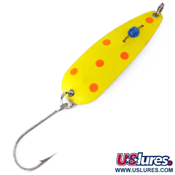 Pintura amarilla y vibrantes puntos rojos cubren el cuerpo de 7,5 cm (3") de esta cucharilla ondulante Eppinger Red Eye Evil Eye UV. Registrada con el código de producto 10496, el señuelo presenta el icónico «ojo» de perla de vidrio azul fijado en su centro. Aunque parece amarillo brillante a la luz del día, el acabado está formulado para emitir un brillo verde luminoso cuando se expone a la luz UV, un detalle técnico destinado a aumentar su presencia en las capas de agua más profundas. El equipo consta de un anzuelo simple de gran abertura y un robusto anello de llavero, diseñados específicamente para el curricán. Este ejemplar se encuentra en condición 5/5, manteniendo un acabado suave y la perla de vidrio transparente. Su peso de 6g (3/16oz) proporciona una sensación sólida a su perfil compacto.