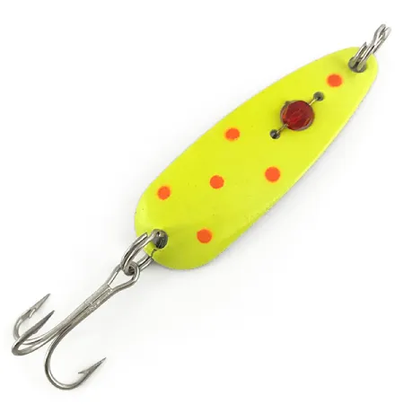 Con una longitud de 5,7 cm (2 1/4"), esta clásica cucharilla ondulante presenta una base amarilla vibrante decorada con puntos naranja y rosa. La emblemática cuenta roja facetada está fijada de forma segura en el centro del cuerpo metálico, un elemento de diseño icónico de los Red Eye Lures fabricados en EE. UU. Con un peso de 14 g (1/2 oz), la cucharilla está diseñada para aplicaciones versátiles de lanzado pesado o curricán. El acabado UV específico de este modelo Red Eye Evil Eye proporciona un brillo de alto contraste cuando se expone a la luz ultravioleta. Identificada con el código 7366, el acabado de la muestra está perfectamente conservado. Está sin usar y en condiciones excepcionales, reflejando el control de calidad de la fabricación original estadounidense. Un anzuelo triple de alta resistencia y anillas abiertas de acero inoxidable completan el montaje, garantizando su funcionalidad tanto para el pescador como para el coleccionista.