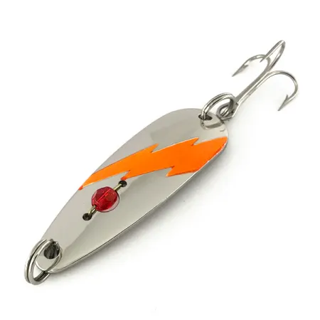 El niquelado crea un fondo de gran destello para la calcomanía de rayo naranja vibrante en este Red Eye Lures Evil Eye UV. Identificada con el código de producto 7556, esta cucharilla de casting pesa 1/2 oz (14 g) y mide 2 1/4" (5,7 cm). Una característica distintiva de este modelo fabricado en EE. UU. es la cuenta roja tallada fijada al cuerpo de la cucharilla cerca del anilla de sujeción, que refleja la luz de forma distinta al metal pulido. Al exponerse a la luz ultravioleta, el rayo naranja fluorescente reacciona con un brillo intenso, mejorando la visibilidad en aguas profundas o turbias. El señuelo viene equipado con un anzuelo triple estándar y anillas de montaje. Este artículo específico se encuentra sin usar, mostrando el acabado original de fábrica sin señales de desgaste.
