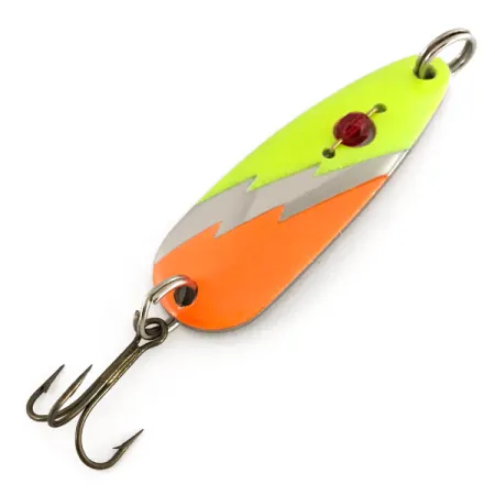 Con un peso de 1/2 oz (14 g), el acabado tricolor de esta cucharilla ondulante de lanzado está dividido por un distintivo patrón de rayo en zigzag. Este modelo Red Eye Lures Red Eye Evil Eye UV, código de producto 7648, combina una base de níquel pulido con segmentos vibrantes en naranja y chartreuse. Una característica clave de esta cucharilla fabricada en EE. UU. es la cuenta de vidrio rojo facetada montada en la parte superior del cuerpo, que actúa como un prominente punto de ataque. Bajo la luz ultravioleta, las secciones de pintura fluorescente brillan con alta intensidad, aumentando significativamente la visibilidad para sesiones de lanzado en aguas profundas o días nublados. Con una longitud de 2 1/4" (5,7 cm), el señuelo está equipado con herrajes originales, incluyendo anillas abiertas de alta resistencia y un anzuelo triple afilado. Este ejemplar no ha sido usado y se mantiene en excelentes condiciones.