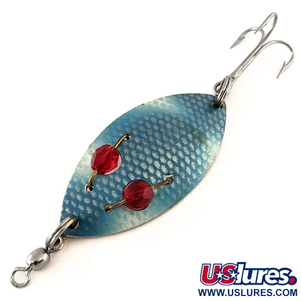 Cuentas de vidrio rojo facetadas están cableadas de forma segura en el cuerpo de la cucharilla, sirviendo como los icónicos puntos de ataque que dan nombre a la Hofschneider Red Eye Junior. Con unas medidas de 5,5 cm (2 1/4") y un peso de 11 g (2/5 oz), este señuelo específico, bajo el código de producto 11330, presenta un vibrante patrón de escamas azules sobre una base plateada. La parte posterior de la cucharilla es de níquel pulido, claramente estampada con la marca del fabricante de Rochester, NY. Los pescadores suelen confiar en esta forma clásica para una recogida lenta, lo que la convierte en un elemento básico para la pesca de lucio y perca en aguas cálidas. El montaje consta de un robusto esmerillón en la punta y un brillante anzuelo triple en la cola. Con un estado de conservación de 5/5, el señuelo conserva su brillo original tanto en la cara pintada como en la parte inferior metálica.