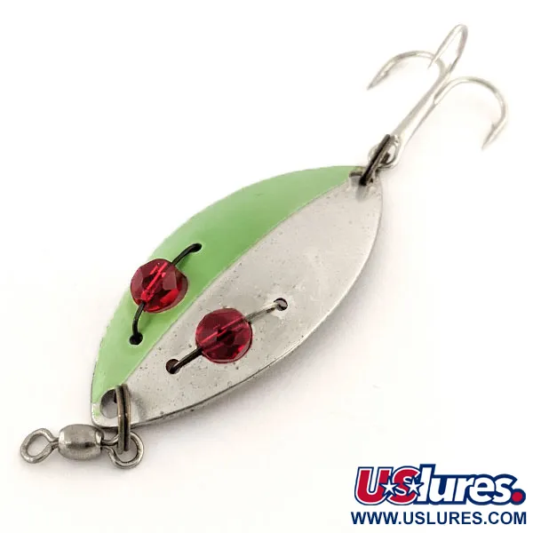En el cuerpo de níquel estampado destacan dos cuentas de cristal rojo facetado que dan nombre a este Eppinger Red Eye junior. Con una longitud de 5,5 cm (2 1/4"), esta cucharilla presenta una estética bitono con una pintura verde lima que cubre la mitad de la superficie de níquel pulido. Este modelo específico, código de producto 12801, está diseñado para una recogida lenta, lo que convierte a la cucharilla en un clásico histórico para la pesca estival de lucio y perca. La parte inferior está claramente estampada con "RED EYE SPINNING LURE", identificando su lugar en el linaje de los aparejos fabricados en EE. UU. Con un peso de 11 g (2/5 oz), los componentes incluyen un anzuelo triple grande y un eslabón de barril preinstalado. En un estado de 5/5, el acabado está excepcionalmente bien conservado y los colores permanecen vibrantes en toda la superficie metálica.