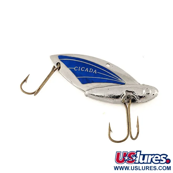 Superficies niqueladas se combinan con un contraste azul profundo en este modelo 11470, resaltando el grabado 'CICADA' centrado en su ala metálica. Con un peso de 11 g (2/5 oz) y una longitud de 5 cm (2"), este blade bait está diseñado para jigging vertical o aplicaciones de lanzado. El hardware consiste en dos anzuelos dobles de tono bronce, uno ventral y otro en el borde posterior, diseñados para minimizar enganches. Este ejemplar fabricado en EE. UU. tiene una calificación de 5/5, mostrando un logotipo nítido y pintura bien conservada en los detalles azules. El cuerpo de plomo está moldeado de forma segura alrededor de la base de la hoja, proporcionando la densidad necesaria para técnicas de fondo.