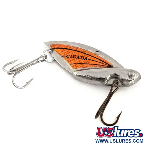 Los tonos níquel y naranja definen el acabado de este blade bait fabricado en EE. UU., con el código de referencia 12807. Con un peso de 11 g (2/5 oz) y una longitud de 5 cm (2"), el cuerpo metálico lleva grabado claramente el nombre 'CICADA' sobre el inserto del ala con patrón naranja. El montaje incluye dos poteras afiladas; el anzuelo ventral está asegurado a través de la cabeza de plomo lastrada, mientras que el anzuelo trasero se une a la cola mediante una anilla abierta. Este ejemplar se encuentra en excelente estado, mostrando una superficie brillante y colores vibrantes, lo que justifica una calificación de 5/5. El punto de enganche se ubica en el borde superior de la pala, una configuración estándar para lances o técnicas de jigging vertical. La sección de la cabeza de plomo está limpia y el patrón de escamas en el ala naranja ofrece un fuerte contraste con el niquelado.
