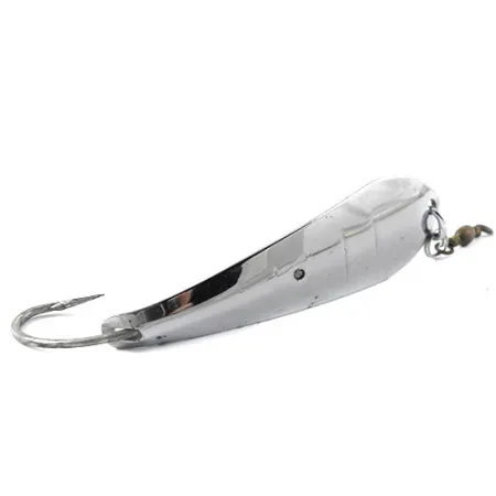 Un baño de níquel brillante cubre el cuerpo en forma de lágrima de 7 cm (2 3/4") de esta clásica cucharilla ondulante Luhr Jensen. Con un peso de 12 g (2/5 oz), la Reflecto #3, identificada con el código de producto 1176, cuenta con una construcción anti-hierba especializada diseñada para pescar en vegetación densa. Un anzuelo simple de gran grosor está integrado en el cuerpo de la cucharilla mediante un protector metálico atornillado que resguarda la punta de los enganches. La cabeza de este señuelo fabricado en EE. UU. está equipada con un quitavueltas de barril de alta calidad y una anilla abierta para evitar la torsión de la línea durante el lanzado o el curricán. Este espécimen concreto mantiene un estado de 5/5, mostrando una superficie altamente reflectante en todo el perfil metálico. La marca Luhr Jensen y el nombre del modelo están claramente grabados en el metal en la parte inferior de la cucharilla, cerca del punto de fijación del anzuelo.