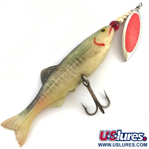 Los tonos verdes y rojos definen el perfil visual de este ejemplar de 40g (1 1/3 oz), que lleva el código de producto 4520 de la gama Renosky Lures. Con una longitud total de 17 cm (6 3/4"), el señuelo está construido con un cuerpo blando y realista que muestra una transición natural de un lomo verde oliva a un vientre de color crema pálido. Una hoja de spinner de sauce se sitúa en la cabeza, con un llamativo inserto rojo y montada junto a una serie de cuentas doradas y una única cuenta roja de enfoque. El vientre está equipado con un anzuelo triple robusto y bien conservado, asegurado al armazón de alambre interno. Los coleccionistas apreciarán los detalles pintados a mano, incluyendo el ojo amarillo y negro y el acento rojo brillante en la línea de las agallas. El cuerpo muestra sutiles marcas verticales y detalles de aletas texturizados, manteniendo una calidad muy alta que refleja una calificación de estado 5/5. Originario de USA, el trabajo artesanal en este modelo específico de Renosky destaca la integración de herrajes de alto brillo con un perfil de plástico blando texturizado.