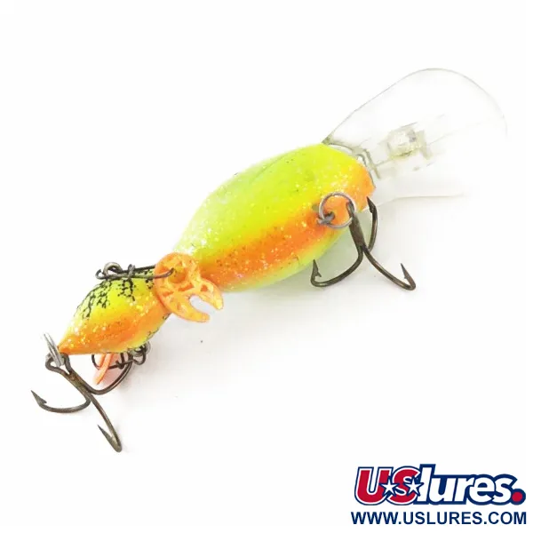 El patrón Fire Tiger con destellos de purpurina dorada cubre el cuerpo escalonado de este Renosky Lures Guido's Double Image. Con un peso de 9,5 g (1/3 oz) y una longitud de 6 cm (2 1/4"), su forma inusual fue diseñada por Gabriel "Guido" Renosky para imitar la silueta de dos peces pasto nadando juntos. El babero transparente de este modelo flotante alcanza profundidades de entre 0,3 y 1,6 m al lanzado, y puede llegar a los 2,1 m haciendo curricán. Pequeños trailers de plástico naranja sujetos al anzuelo ventral aportan un contraste adicional contra el vientre chartreuse brillante. Los sonajeros internos añaden un elemento ruidoso a la presentación, que resulta efectiva con recogidas lineales o stop-and-go. Este ejemplar en estado 5/5 mantiene su brillo original y su perfil único, catalogado bajo el código 24467.