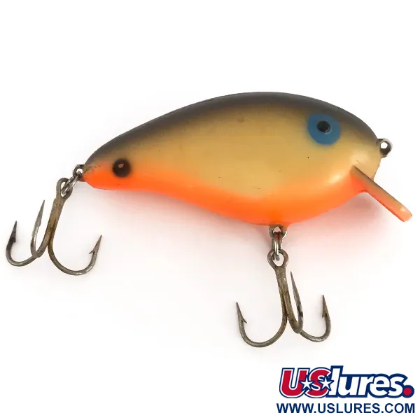 Con una medida de 7 cm, el Rogers Big Jim presenta un perfil de color clásico con un lomo marrón ahumado oscuro que transiciona hacia un centro crema y un vientre naranja intenso. Este ejemplar específico, con el código de producto 7769, pesa 14 g (1/2 oz), lo que proporciona masa suficiente para lanzados precisos hacia estructuras sumergidas. El diseño incluye un babero integrado transparente y un par de anzuelos triples afilados, con el ojal delantero situado en la parte superior del morro. Destaca su gran ojo azul pintado con pupila negra, un detalle estético característico de los señuelos Rogers desde la fundación de la empresa en 1959. Fabricado en EE. UU., el acabado se mantiene extraordinariamente limpio, con una calificación de estado de 5/5. El tono naranja se extiende desde la barbilla por todo el vientre, contrastando fuertemente con los tonos más apagados de la parte superior y los herrajes plateados.