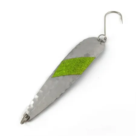 Con un peso de 16 g (3/5 oz), el cuerpo de metal martilleado de esta cucharilla presenta una superficie texturizada diseñada para captar la luz a través de un patrón similar a un panal. Una franja diagonal de purpurina verde vibrante recorre el centro del acabado en tono plateado, actuando como el principal foco visual. Con una longitud de 11,5 cm (4 1/2"), el señuelo está equipado con un robusto anzuelo simple y anillas abiertas en ambos extremos. Identificado con el código de producto 23629, este modelo Sammy PAC (07) de 1986 refleja el estilo de fabricación de su época. Su estado muestra las marcas de una extensa trayectoria de pesca, con un desgaste superficial y signos de oxidación que le otorgan un carácter auténtico y muy utilizado, con una calificación de 1/5.