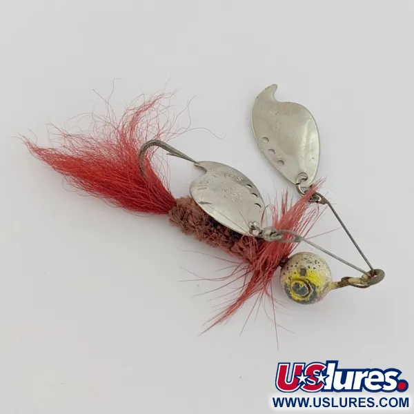 Grabadas directamente en las palas de níquel se encuentran las marcas "SHANNON" y "PAT PEND USA", firma del diseño de Jamison producido desde los años 20 hasta los 40. Este Shannon Twin Spinner de 5 cm combina palas dobles con una cola de pluma roja vibrante y un cuerpo de chenilla marrón texturizado. Con un peso de 10 g, la cabeza de plomo muestra su carácter con la pintura amarilla y negra envejecida (estado 4/5). El armazón de alambre sitúa las palas sobre el cuerpo, un diseño pensado para lanzar en coberturas densas o lechos de algas. Las plumas rojas se mantienen densas y brillantes, contrastando con el acabado de níquel. Identificado con el código #24491, el Shannon refleja las primeras innovaciones en señuelos antialgas.