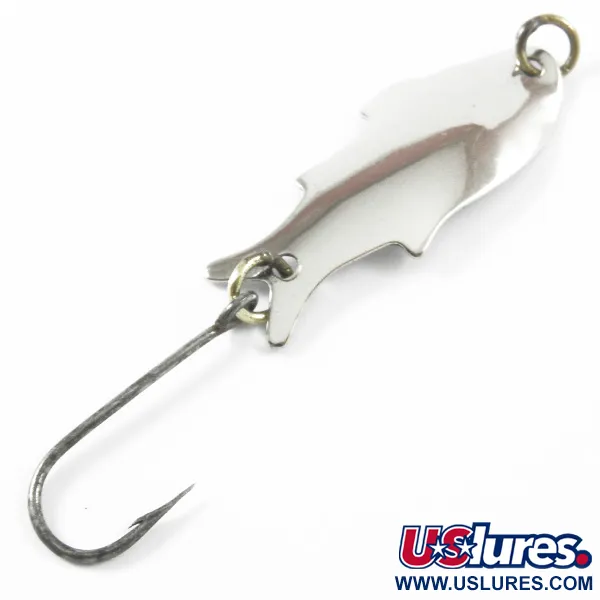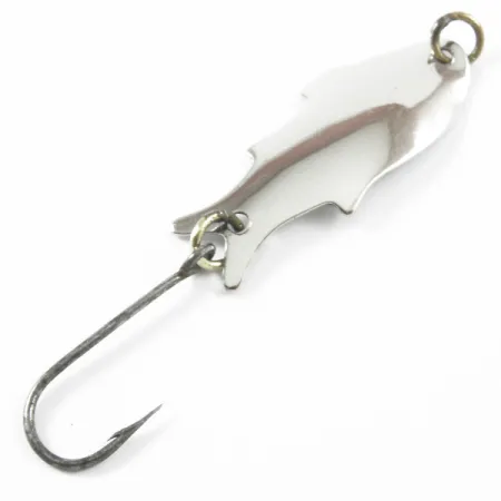 El niquelado pulido refleja la luz a lo largo del cuerpo de 4 cm (1 1/2") de esta clásica cucharilla ondulante de fabricación estadounidense. Grabada claramente en el reverso se encuentra la marca «SHOFF'S BIG TRIPLE TEAZER», firma de la Shoff's Tackle Company de Kent, Washington. Con un peso de 2,5 g (3/32 oz), la cucharilla presenta un perfil distintivo con silueta de pez, con aletas estilizadas que le dan al metal su forma característica. Para el coleccionista de aparejos del Noroeste del Pacífico, este ejemplar —con código de producto 3295— es un excelente ejemplo de la metalistería de mediados de siglo. Viene montada con un anzuelo simple sujeto por un anilla abierta en tono latón en la cola, y otra anilla de sujeción a juego en la parte delantera. Una calificación de estado de 4/5 indica un ligero desgaste en el acabado, manteniendo un alto nivel de brillo para exhibición o pesca ligera. La curvatura del metal y los detalles estampados están bien conservados.