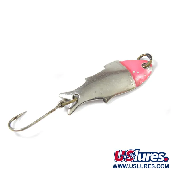 Troquelado directamente en el metal en la parte inferior, el nombre Triple Teazer identifica esta clásica cucharilla de fabricación estadounidense de Shoff's. Con solo 3 cm (1 1/4") y un peso delicado de 1,1 g (1/32 oz), este pequeño señuelo fue diseñado para aplicaciones de pesca ligera y ultra-light. El cuerpo niquelado presenta una silueta con perfil de pez, completa con una aleta dorsal distintiva y una cola ahorquillada. Un toque vibrante de pintura roja cubre la sección de la cabeza cerca del enganche, proporcionando un estímulo visual para los peces cercanos. Sujeto mediante una anilla abierta en la parte trasera, el anzuelo simple permanece limpio y afilado. Fabricado en los EE. UU., este ejemplar lleva el código de producto 2171 y muestra una suave historia de uso, obteniendo una sólida calificación de estado de 4/5. El chapado conserva gran parte de su brillo original, resaltando claramente el texto troquelado que marca el legado de Shoff's en la escena de pesca del Pacífico Noroeste.