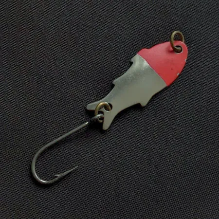 El acabado clásico de este ejemplar de 3 cm (1 1/4") se define por el níquel y la pintura roja, representando el diseño orientado al estilo finesse de la Shoff's Triple Teazer. Con un peso de solo 1,1 g (1/32 oz), el cuerpo de metal troquelado presenta un perfil de pez distintivo que subraya su herencia de fabricación estadounidense. En el lado cóncavo posterior, la marca del fabricante es claramente visible, identificando el señuelo bajo el código de producto 22327. Los herrajes consisten en un anzuelo simple afilado sujeto por una anilla abierta de latón, pensado para aplicaciones de pesca ligera dirigidas a truchas o peces de pequeño porte. En cuanto a su estado, esta pieza cuenta con una calificación de 5/5, mostrando una superficie muy bien conservada donde el níquel pulido y la vibrante pintura roja de la cabeza permanecen brillantes e intactos. Una segunda anilla abierta de latón en el morro sirve como punto de conexión principal para la línea del pescador.