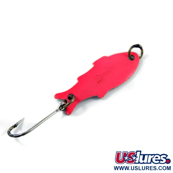 Un vibrante acabado rojo cubre la parte superior de este señuelo con forma de pez, contrastando con su parte inferior de color blanco limpio. Fabricado en EE. UU. por Shoff's, este Triple Teazer (Código de Producto 2420) es un espécimen de peso pluma de solo 1/32oz (1,1g). El cuerpo de metal estampado de 1 1/4" (3cm) presenta un perfil distintivo, con sutiles contornos de aletas grabados en el metal. Los herrajes incluyen anillas abiertas sencillas y funcionales en ambos extremos, que sujetan un anzuelo simple afilado diseñado para lance ligero o jigging. En cuanto a su estado, recibe un 4/5, mostrando solo ligeras señales de su antigüedad, mientras que el anzuelo permanece brillante y la transición de pintura roja a blanca está bien definida en los bordes.