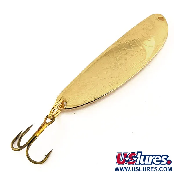 El chapado en oro proporciona un brillo de espejo en el cuerpo de 5,8 cm (2 1/4") de esta clásica cucharilla de lance. Con un peso de 9 g (1/3 oz), el Acme Side-winder S-100 (Código 12278) presenta grabados detallados de escamas de pez y un patrón de agallas estampado en su cara convexa. Este ejemplar está en condición 5/5, manteniendo una superficie reflectante uniforme tanto en su parte frontal texturizada como en su parte posterior lisa y pulida. Fabricado en los USA, la construcción de metal macizo se complementa con una anilla abierta dorada y un anzuelo triple afilado en el extremo posterior. Un orificio perforado limpiamente en el extremo estrecho sirve como punto de sujeción de la línea, manteniendo el perfil estilizado diseñado para el lance y el curricán.
