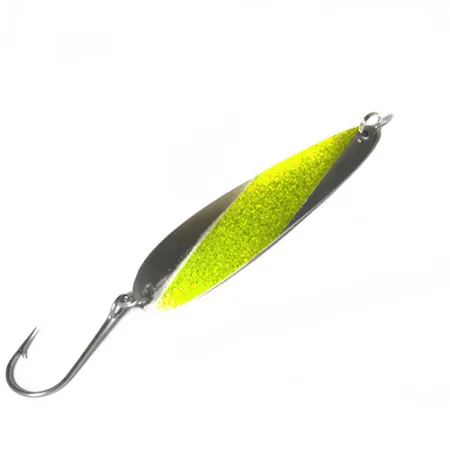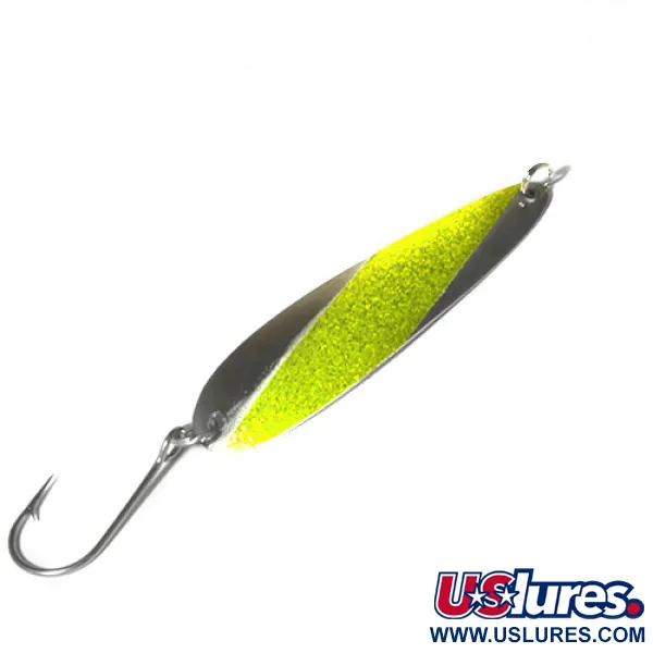 Con un peso de 11,5 g (2/5 oz), esta cucharilla ondulante Slammer destaca por su franja diagonal dorada con purpurina sobre un cuerpo de níquel pulido. Fabricada en EE. UU., esta especialista en curricán de 9,5 cm (3 3/4") lleva el nombre del fabricante estampado en el reverso de níquel limpio. El modelo 0480 está equipado para trabajos pesados con un anzuelo simple y robusto unido mediante una anilla abierta resistente, una configuración preferida por los pescadores de los Grandes Lagos y zonas costeras para asegurar especies de mandíbulas fuertes. El acabado proporciona un destello de alto contraste, combinando la reflectividad del níquel con el brillo texturizado del acento dorado-chartreuse. Con una valoración de estado de 4/5, las superficies metálicas conservan su brillo original y los herrajes se mantienen firmes y funcionales. Diseñada específicamente para el ritmo constante del curricán, el perfil alargado y delgado de la Slammer 0480 está moldeado para navegar con estabilidad a varias velocidades.