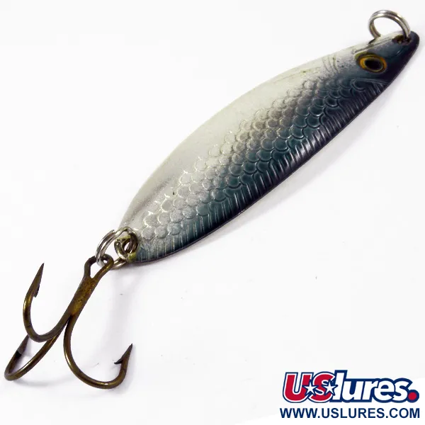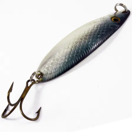 Un patrón clásico de escamas de arenque adorna la parte superior de esta cucharilla de 7,5 cm (3"), pasando de un lomo gris azulado profundo a un vientre blanco plateado reluciente. Originaria de Noruega, esta Sølvkroken Storlaksen, identificada con el código de producto 3356, representa un elemento básico en el equipo escandinavo para salmón y trucha de mar. Con un peso de 10 g (1/3 oz), el cuerpo alargado y ligeramente curvado está claramente estampado en el reverso con el nombre de la marca y 'Norway'. El hardware está en óptimas condiciones, con dos robustas anillas abiertas y un anzuelo triple bronceado adecuado tanto para lance como para curricán ligero. Un ojo amarillo pintado con pupila negra en la cabeza proporciona un objetivo realista para los peces de presa. Este ejemplar se encuentra en una condición 5/5, manteniendo su brillo metálico pulido. En la cara interna plateada, queda un pequeño punto verde de su época en la colección de un propietario anterior.
