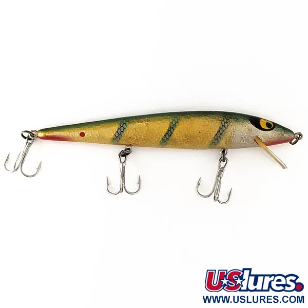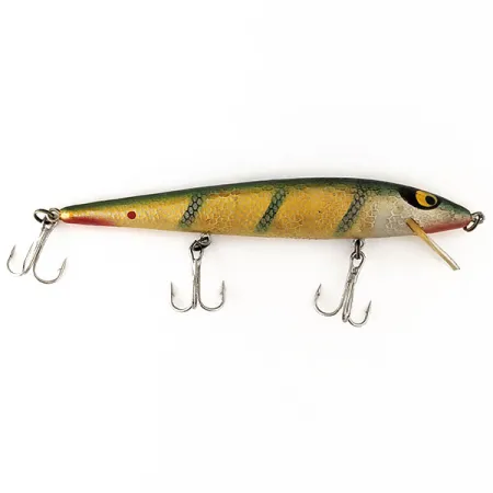 Barras verticales de patrón perca sobre un cuerpo dorado definen la estética de este Smithwick Suspending Rattlin’ Rogue. Con el código de producto 11173, este señuelo de 12,07 cm pesa 11,34 g y es un clásico de la historia de la pesca estadounidense. El acabado está en condiciones excepcionales (5/5), destacando la garganta roja y los icónicos ojos amarillos de gran tamaño con pupilas negras. Diseñado como modelo suspending con sonajeros internos, mantiene una flotabilidad neutra. Alcanza profundidades de 0,3 m a 2 m en lance y de 3 m a 4 m en curricán. Está equipado con tres anzuelos triples y un babero redondeado transparente.