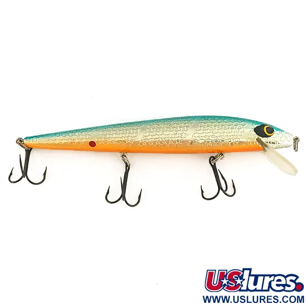 Un vientre naranja vibrante contrasta con los flancos de escamas plateadas de este Smithwick Suspending Rattlin’ Rogue, catalogado con el código de producto 7496. Con una longitud de 11,5 cm (4 1/2") y un peso de 10 g (1/3 oz), el cuerpo remata en un lomo azul cerceta y presenta la clásica mancha roja en las agallas. Este ejemplar se mantiene en excelente estado (5/5), con el dibujo de las escamas y el acabado sin marcas de uso. Diseñado con un babero transparente, alcanza profundidades de 0,3–2 m en lance, o hasta 3–4 m en cacea. Tres anzuelos triples oscuros están montados firmemente en la parte inferior. El mecanismo interno de sonajero y su flotabilidad neutra (suspending) son las características técnicas principales de este señuelo fabricado en EE. UU. Los ojos negros con borde amarillo situados cerca del morro completan su perfil.