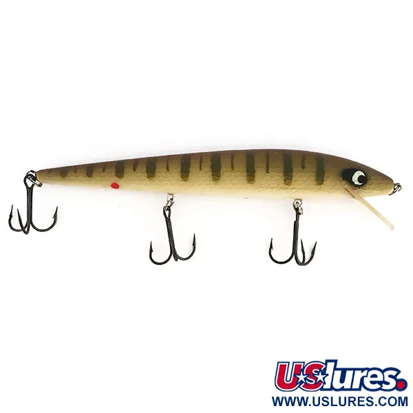 Un patrón clásico de lucio con barras verticales oscuras sobre un degradado marrón canela adorna el cuerpo de 14 cm (5 1/2") de este señuelo vintage. Catalogado bajo el código de producto 8906, el Smithwick Suspending Rattlin’ Rogue está diseñado para una flotabilidad neutra (suspending), lo que le permite mantenerse en la zona de ataque en lances de 0,3 m a 2 m de profundidad. Para curricán, el babero transparente lleva el señuelo al rango de 3 m a 4 m. Este ejemplar está en condición 5/5, conservando un acabado impecable con sus característicos ojos blancos y negros y un punto de ataque rojo cerca del anzuelo de cola. Los tres anzuelos triples están fijados de forma segura al cuerpo de 14 g (1/2 oz), que alberga un sistema de sonajero interno típico de la producción vintage de Smithwick.