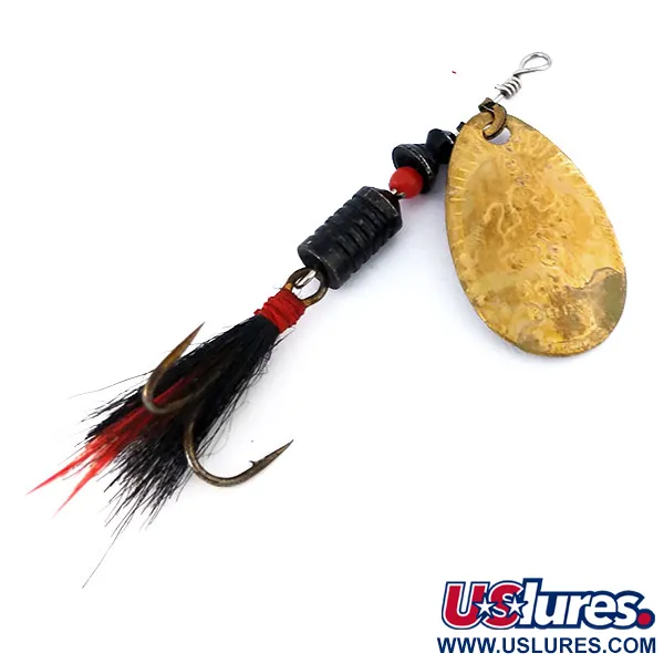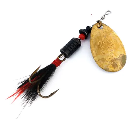 El acabado de latón en la pala en forma de lágrima de 6 cm (2 1/4") muestra un envejecimiento natural suave acorde con una calificación de 4/5. Este South Bend 3, bajo el código de producto 10636, es un ejemplo de la fabricación clásica de USA y pesa 7 g (1/4 oz). El eje central de alambre sostiene un cuerpo lastrado compuesto por segmentos negros ranurados y detalles de cuentas de color rojo brillante, creando un perfil visual de alto contraste. En la parte posterior, el anzuelo triple está adornado con plumas negras naturales y reflejos rojos, un detalle pensado para proporcionar una silueta más voluminosa bajo el agua. Los componentes permanecen firmes, con un quitavueltas funcional en la cabeza y un eje recto. El ligero desgaste superficial en las piezas de latón confirma su historia vintage, manteniendo su integridad estructural para coleccionismo o pesca ligera.