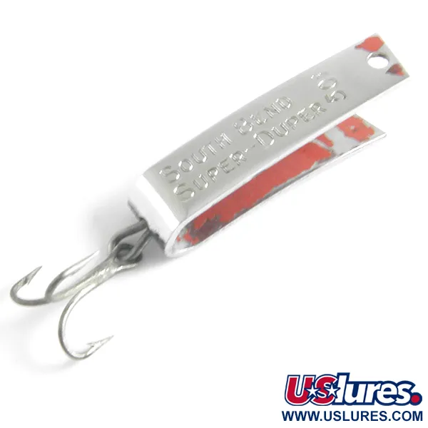 Con un peso ligero de 3/32 oz (2,3 g), el cuerpo con acabado de níquel de este clásico señuelo de lanzado presenta el icónico diseño con curvatura en U que ha fascinado a los pescadores durante décadas. Con una longitud de 1 1/4" (3 cm), la superficie metálica tiene grabado 'SOUTH BEND SUPER-DUPER 501' en un lado y el número de patente original en el otro. La curva interior y los extremos conservan detalles visibles de pintura roja, que contrastan con el níquel pulido. Este ejemplar específico, identificado con el código de producto 4297, representa el innovador material de pesca por el que South Bend se hizo conocida a mediados del siglo XX. El anzuelo triple se mantiene afilado y bien sujeto mediante la anilla trasera. Con una valoración de estado de 4/5, el señuelo luce bien, con un brillo metálico limpio y las inscripciones grabadas con claridad. Un único orificio perforado en el extremo del brazo más largo sirve como punto de enganche para la línea o el bajo de línea.