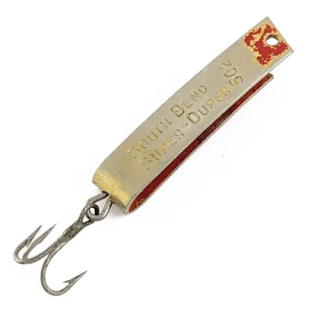 Grabada con nitidez en el acabado de níquel, la marca 'SOUTH BEND SUPER-DUPER 502' identifica este ejemplar como una pieza clásica de la historia del material de pesca estadounidense. Con una longitud de 3 cm (1 1/4"), el cuerpo de metal plegado incorpora el diseño en forma de U característico, concebido para el lanzado ligero y el curricán. Este señuelo de 2,5 g (3/32 oz) conserva gran parte de su brillo original, aunque los detalles en pintura roja cerca del ojal muestran cierto desgaste natural. Al girar el cuerpo se aprecia la marca 'PAT. PEND'G' estampada en el pliegue inferior, un detalle propio de las primeras series de producción con el código de producto 16953. Con una valoración de 4/5, la superficie metálica presenta algunas marcas dispersas debido a su tiempo en la caja de pesca. Un anzuelo triple está sujeto a la curva trasera mediante una anilla abierta, completando su montaje original.