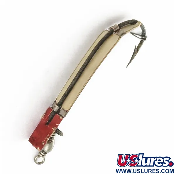 Con una longitud de 4,5 cm (1 3/4"), este señuelo para pesca con mosca en color blanco y rojo es una creación clásica de South Bend de la década de 1940. Identificado con el código de producto 24087, el Trix-Oreno tiene un peso ligero de 2 g (1/16 oz) y fue diseñado específicamente para ayudar a los pescadores a mosca a alcanzar mayores profundidades. Su diseño se distingue por un cuerpo esbelto en color hueso, fijado al anzuelo mediante bandas metálicas y rematado con una llamativa cabeza roja. Con una valoración de estado de 4/5, el señuelo solo muestra ligeras huellas de su antigüedad, conservando la pintura y los componentes metálicos en muy buen estado. Históricamente, South Bend concibió este señuelo para ser lanzado a través o a favor de la corriente en ríos, donde se hunde de forma natural imitando la vida acuática. Este comportamiento resultó muy eficaz para pescar truchas a principios de temporada o para tentar a ejemplares de mayor tamaño en aguas profundas durante el verano. Los herrajes incluyen un pequeño quitavueltas de alambre en el punto de enganche y un anzuelo simple orientado hacia arriba en la parte trasera.