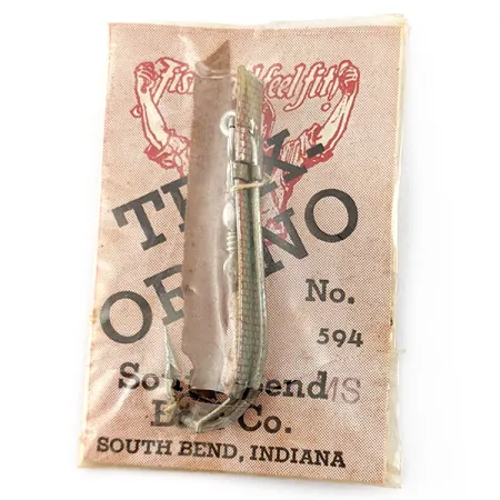 Con una longitud de 4,5 cm (1 3/4 pulgadas), el acabado plateado y rojo de este señuelo metálico exhibe un diseño clásico de mediados de siglo. Con un peso de 2 g (1/16 oz), el South Bend Trix-Oreno 594 fue fabricado para ser utilizado con caña de mosca, diseñado para ser más ligero que una cucharilla rotativa y facilitar así su manejo. Este ejemplar presenta el código de producto 21699 y no ha sido usado, conservándose en su envoltorio original de papel y plástico de la South Bend Bait Co. de Indiana. El señuelo está diseñado para profundizar con un movimiento errático similar al de un insecto vivo, lo que ayuda a tentar a las truchas y otras especies en pozas profundas durante el inicio de la temporada o en días de calor intenso. Al recuperar, su construcción le permite cabecear, sumergirse y zigzaguear por el agua como un pez pasto. Las instrucciones originales especifican que este modelo monta un anzuelo del número 1 y ofrece un excelente rendimiento cuando se utiliza con una tira de piel de cerdo (pork rind).