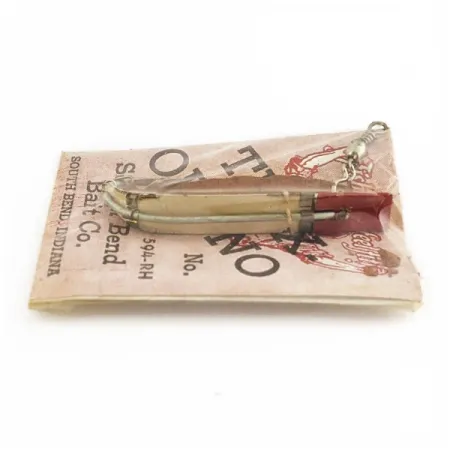 Con una longitud de 4,5 cm (1 3/4"), este señuelo para mosca con acabado plata y rojo se conserva sin usar en su cartón de presentación original. South Bend fabricó este modelo 594-RH con un peso de 2 g (1/16 oz), diseñado específicamente para una acción de hundimiento que imita pequeños insectos o alevines. Es posible llegar a las truchas en aguas más profundas durante los cambios estacionales de temperatura porque el cuerpo reacciona al más mínimo movimiento de la puntera de la caña. El diseño incluye una pequeña lentejuela metálica, y el cartón original proporciona instrucciones para añadir una tira de tocino al anzuelo para aumentar la visibilidad. La información al dorso del envase indica que esta serie también incluía los modelos 593 y 594D para diversas aplicaciones de pesca ligera. Código de producto 24506.