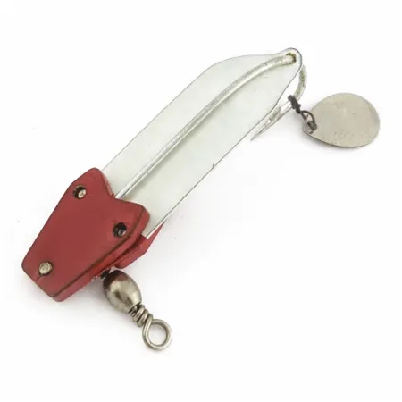 El Trix-Oreno fue producido por South Bend en la década de 1940. Con un peso de 3/5 oz (17 g), este diseño especializado cuenta con una distintiva sección de cabeza roja fijada mediante tres tornillos sobre un cuerpo cónico de metal blanco. El armazón de 2 1/4" (6 cm) está diseñado para hundirse de forma natural, imitando el descenso de un insecto por la columna de agua incluso sin recogida activa. Los pescadores que buscan truchas en zonas profundas durante temperaturas extremas pueden confiar en la forma en que el South Bend Trix-Oreno 595 se sumerge y realiza quiebros con sutiles movimientos de la puntera. La parte trasera está equipada con un anzuelo simple y una pequeña hoja metálica para añadir atractivo visual. Para aquellos que deseen añadir volumen, la sugerencia original del fabricante consiste en fijar una pequeña tira de piel de cerdo al anzuelo. Un robusto quitavueltas de barril está integrado en el montaje rojo frontal para evitar la torsión de la línea durante su uso. Este artículo específico, bajo el código de producto 24613, se encuentra en un estado impecable 5/5, con el acabado de la hoja bien conservado.