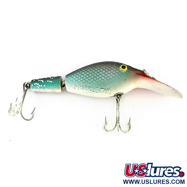 Con una longitud de 8 cm (3 1/4 pulgadas), este señuelo Eppinger articulado presenta un patrón de escamas distintivo en gris y azul claro sobre un vientre blanco crema. Su peso de 10 g (1/3 oz) lo convierte en una opción versátil tanto para lanzado como para curricán al pescar lucio, lucioperca o trucha. Catalogado con el código 8108, lleva el nombre "SPARKLE TAIL" grabado en el costado y hace honor a su nombre con una cola impregnada de purpurina. Un llamativo toque rojo destaca en el frente, cerca del babero metálico, complementado con los clásicos ojos amarillos pintados. Este ejemplar fabricado en USA se encuentra en un estado 5/5, con una pintura impecable y herrajes originales. La articulación entre el cuerpo y la cola mediante resistentes anillas metálicas asegura la integridad estructural de esta pieza vintage.