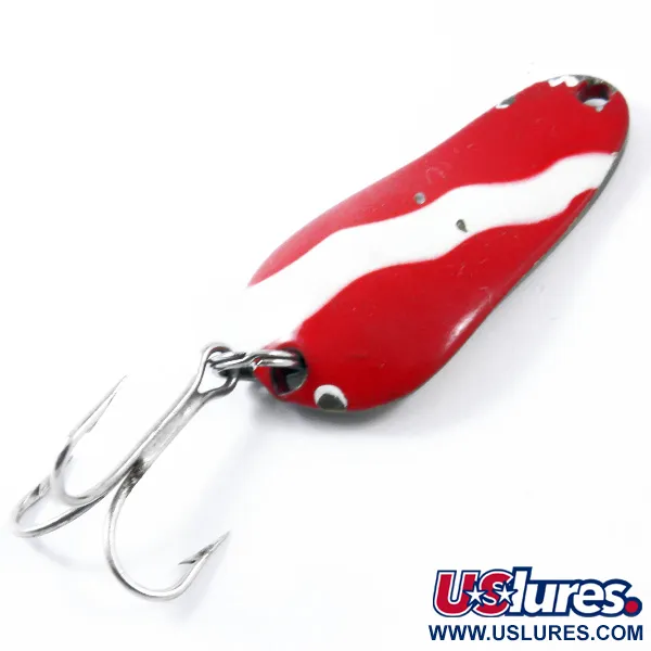Con un tono de latón y claramente estampada, la parte inferior de esta cucharilla lleva la designación Spinno-King No 00. Con unas medidas de 3,5 cm (1 1/2") y un peso de 7 g (1/4 oz), el cuerpo metálico presenta un patrón de ondas rojas y blancas de alto contraste en su superficie frontal. Este ejemplar, con el código de producto 3374, se atribuye a Weller y comparte herencia con la Pecos River Tackle Co. de Nuevo México, EE. UU. El montaje consta de un único anzuelo triple fijado en la base. Pequeños desconchones en el acabado esmaltado reflejan su tiempo en una caja de pesca, lo que resulta en una calificación de estado de conservación de 4/5. Su perfil de lágrima y su sólida fabricación son sellos distintivos de los señuelos metálicos americanos de mediados de siglo.