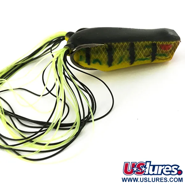 Con un peso exacto de 14 g (1/2 oz), este señuelo de superficie con librea de perca destaca por sus flancos amarillos con franjas verticales oscuras. Con una longitud de 6 cm (2 1/4"), el SPRO Dean Rojas Bronzeye Frog Popper (código 7148) está diseñado con una boca cóncava profunda para desplazar el agua hacia adelante en la superficie. Su cuerpo blando integra un anzuelo doble reforzado, garantizando que el plástico se comprima fácilmente para asegurar una excelente clavada. La garganta en rojo vibrante actúa como un disparador de ataques adicional, complementada por un faldón de goma largo en mezcla negro y chartreuse. Este ejemplar, de diseño estadounidense, no muestra signos de desgaste en el cuerpo ni en los anzuelos, con una calificación de estado 5/5. El lomo oscuro es una elección funcional de Dean Rojas para que el señuelo destaque como una silueta clara cuando se mira desde el fondo bajo coberturas densas.