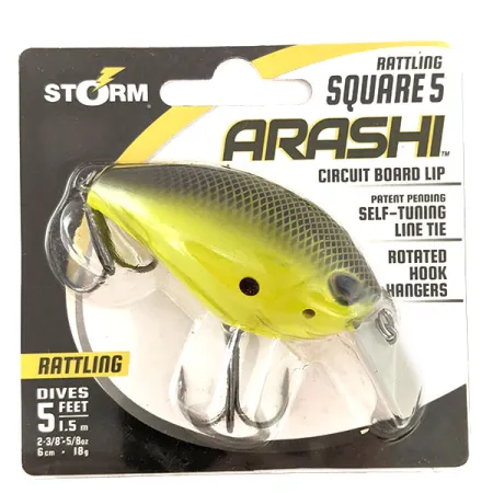 Archivo del museo: Storm Arashi Rattling Square 5 Crankbait, Black Chartreuse Shad, 18g, #11335