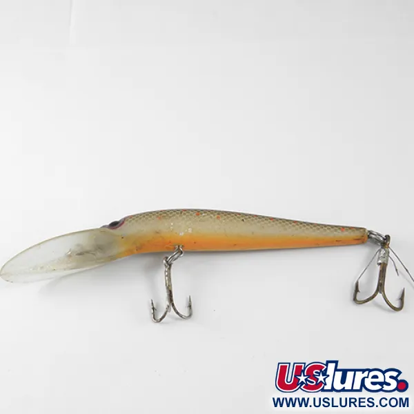 Vestido con un patrón clásico de escamas oliva y oro salpicado de finos puntos naranjas, este ejemplar muestra la artesanía de los señuelos Storm fabricados en EE. UU. Identificado con el código de producto 1228, este Deep Jr Thunder Stick mide exactamente 10 cm (4") y tiene un peso de 9 g (1/3 oz). El babero largo y transparente está diseñado para alcanzar profundidades de entre 2 m y 4 m (6,5 ft a 13 ft), lo que lo convierte en una opción fiable para buscar luciopercas en aguas profundas. Su perfil esbelto se complementa con distintivos ojos rojos y anzuelos triples originales. En cuanto a su estado, el señuelo tiene una calificación de 4/5, mostrando solo ligeras señales de uso previo mientras mantiene su acabado vibrante y sus herrajes. Los pescadores suelen elegir este diseño de minnow flotante para lanzar o hacer curricán sobre estructuras donde la presentación profunda es clave.