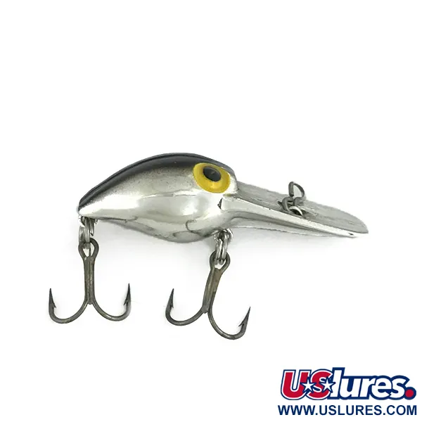 Un acabado cromado plateado brillante define este modelo compacto, resaltando su herencia Pre-Rapala de la producción original de Storm en USA. Con un peso de solo 1/8 oz (4 g) y una medida de 1 1/4" (3 cm), el Pee Wee Wart es un crankbait flotante de profundidad especializado para percas y luciopercas. El babero largo está claramente grabado con el identificador PEEWEE WART, que permanece nítido y legible. Visualmente, el señuelo presenta un lomo negro clásico que contrasta con los laterales plateados, acentuado por unos distintivos ojos amarillos con pupilas negras. Este señuelo, catalogado con el código 7320, se encuentra en un estado excepcional, con una puntuación de 5/5. Ambos anzuelos triples originales están presentes y en buen estado. Al ser producido antes de la adquisición por Rapala, representa una era específica de la fabricación de artículos de pesca estadounidenses, cuando estos crankbaits de perfil pequeño empezaron a ganar popularidad para el lanzado y el curricán.