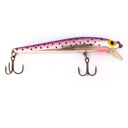 Los costados con acabado cromado y el lomo violeta-rosa definen el patrón Rainbow Trout en este perfil de minnow de 7 g (1/4 oz). Identificado como Código de Producto 10478, este Storm Thunder Stick cuenta con un cuerpo esbelto de 9 cm (3 1/2") diseñado para sumergirse entre 0,3 y 1,5 m (1 ft - 5 ft). Es un ejemplo clásico de fabricación estadounidense, equipado con un babero de plástico transparente y dos anzuelos triples resistentes. Los detalles de pintura incluyen finas motas negras y ojos amarillos brillantes con pupilas negras, característicos de la atención de la marca a las señales visuales. Con una calificación de estado de 5/5, el señuelo muestra una excelente conservación, manteniendo brillantes su acabado metálico y sus herrajes. Su equilibrio y peso lo hacen adecuado para diversas técnicas de lanzado al buscar especies como lucioperca, lucio o trucha en estructuras poco profundas.