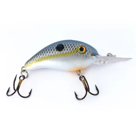 Un lomo azul y gris con patrón de escamas transiciona hacia una línea lateral amarilla distintiva en este Strike King 4XD de 10g (1/3oz). Identificado con el código 10398, el acabado Sexy Shad presenta un vientre blanco perlado con un sutil detalle naranja bajo el babero. Este crankbait flotante está diseñado para alcanzar profundidades de entre 2,4 y 3,6 m (8-12 ft) al lanzar o hacer curricán para lucio y lucioperca. Los sonajeros internos proporcionan un perfil de sonido técnico, mientras que el cuerpo de 5 cm (2") mantiene un perfil compacto. Cada una de las dos poteras con acabado bronce se mantiene en excelente estado, acorde con la condición general 5/5 del ejemplar. Un único punto negro se sitúa en el flanco superior, sello distintivo de este esquema de color específico. El babero grande y transparente está firmemente sujeto, listo para la exploración en aguas profundas.